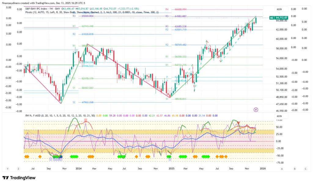 Cierra una semana de fuertes ganancias y marca un ATH. Alcanza el objetivo alcista 64,982. Objetivo a la baja 62,001.