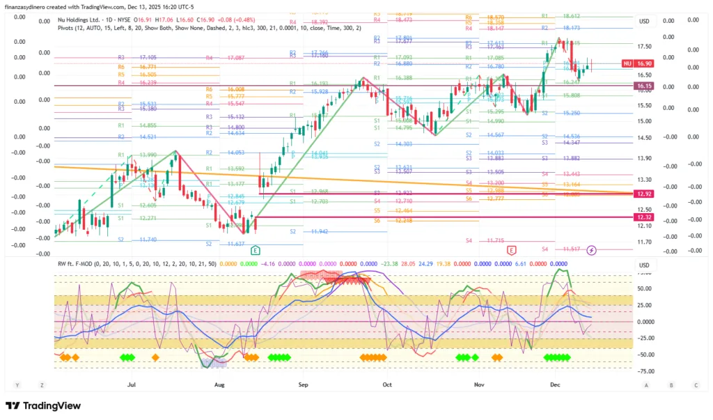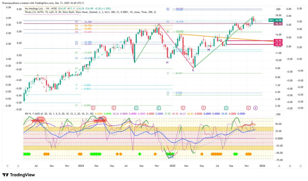 Cierra una semana de ganancias y encuentra soporte en zona $16.15-$16.51. Siguiente resistencia: $19.32. Soporte importante en la zona $14.43/$13.60.