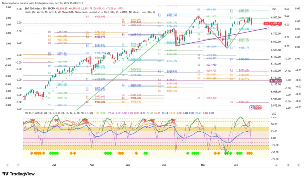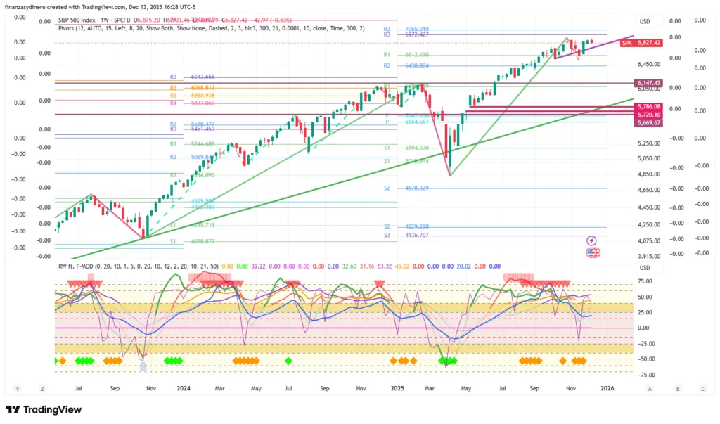 Cierra la semana de perdidas y se acerca al ATH. El mercado esta dando señales de sobreventa. Objetivo bajista 6,147; al alza 6,972.