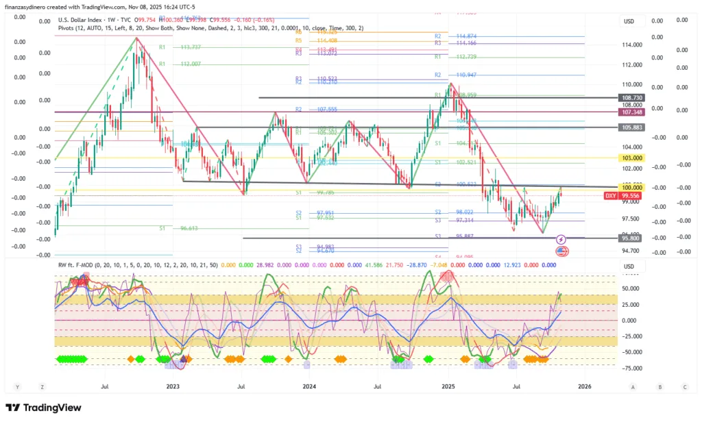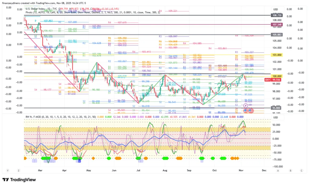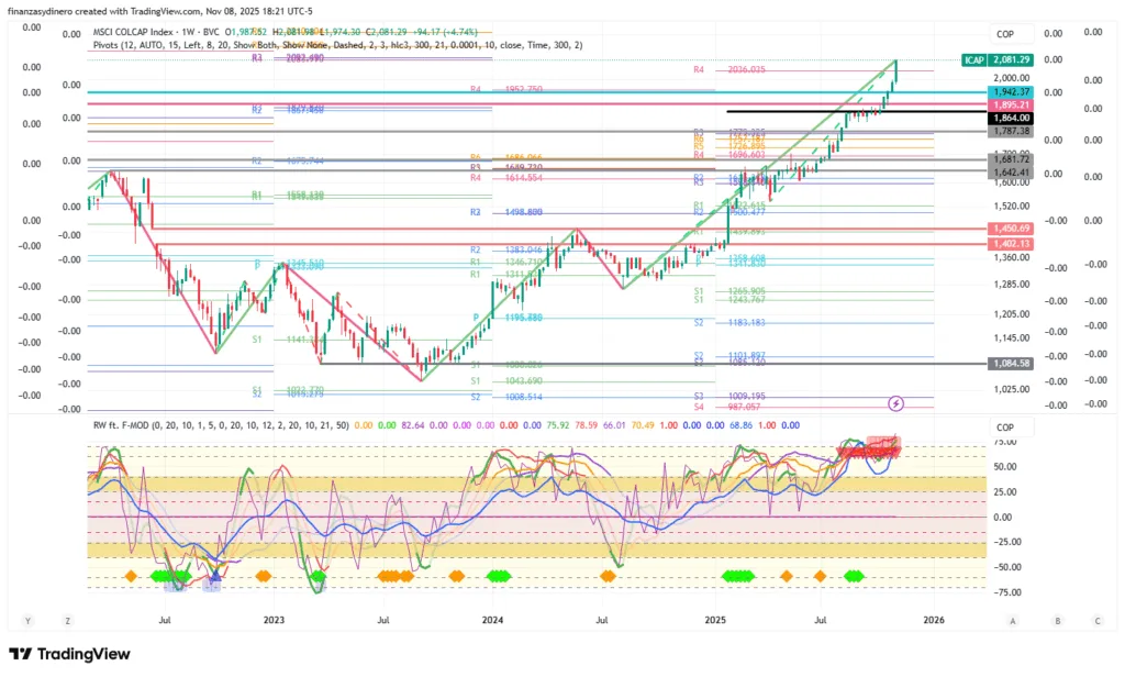 Los mercados financieros latinoamericanos cerraron una semana de contrastes marcados. El peso colombiano se consolidó como la divisa con mejor desempeño frente al dólar en la región, quebrando niveles técnicos importantes y ubicándose en rangos estacionales mínimos para noviembre. En paralelo, las bolsas de valores de México (IPC), Brasil (BOVESPA), Chile (IPSA) y Colombia (COLCAP) alcanzaron nuevos máximos históricos, aunque con señales técnicas de sobrecompra extrema que anticipan posibles correcciones. A nivel global, el índice DXY alcanzó su objetivo de 100 puntos, el oro continúa en territorio de sobrecompra sin precedentes, y los mercados estadounidenses enfrentan crecientes dudas sobre la sostenibilidad de la valoración en el sector de inteligencia artificial.