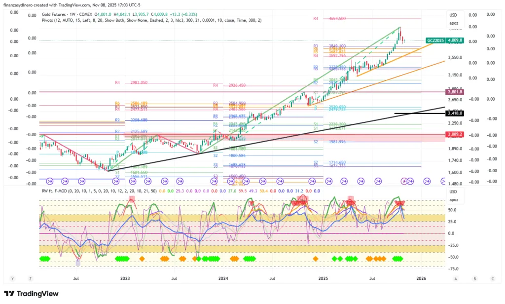 Por otra parte, las condiciones de sobreventa y el soporte que da el patrón antes mencionado deberían apoyar un rebote hacia los $4,004 y la línea de tendencia bajista de corto plazo abril-julio de 2025.