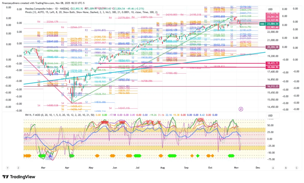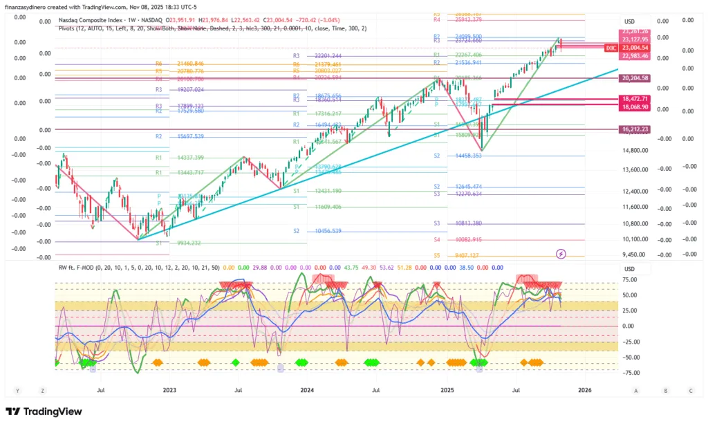 Cierra la semana con fuertes perdidas. Mercado continua en sobrecompra extrema y por lo tanto presenta un alto riesgo de una corrección bajista hacia los 20,204. Aumenta la atención sobre la burbuja-no-es-burbuja I.A.