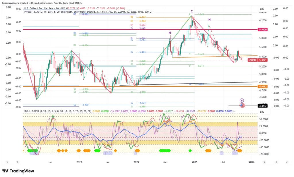 Cierra una semana de perdidas y permanece por debajo de la línea de cuello del patrón HCH. Se forma una divergencia positiva que augura mayores ganancias para el dólar frente al real.