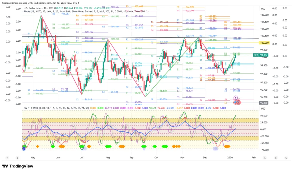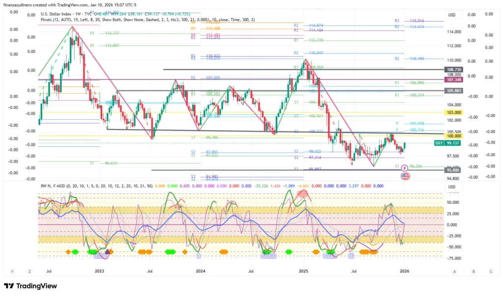 El DXY cierra una semana de ganancias y se encamina a probar los 100. Soporte importante en el doble piso alrededor de los 97.