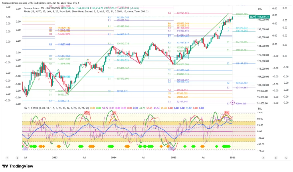 Este comportamiento se da en paralelo a movimientos relevantes en otros mercados: el dólar global (DXY) consolida una base estructural, el oro permanece en niveles extremos de sobrecompra histórica, el petróleo Brent se ve condicionado por tensiones geopolíticas, y las bolsas de América Latina y Estados Unidos operan cerca de máximos históricos con crecientes riesgos de corrección. El análisis conjunto de estos activos permite identificar un entorno de alta sensibilidad macro y técnica para las próximas semanas.