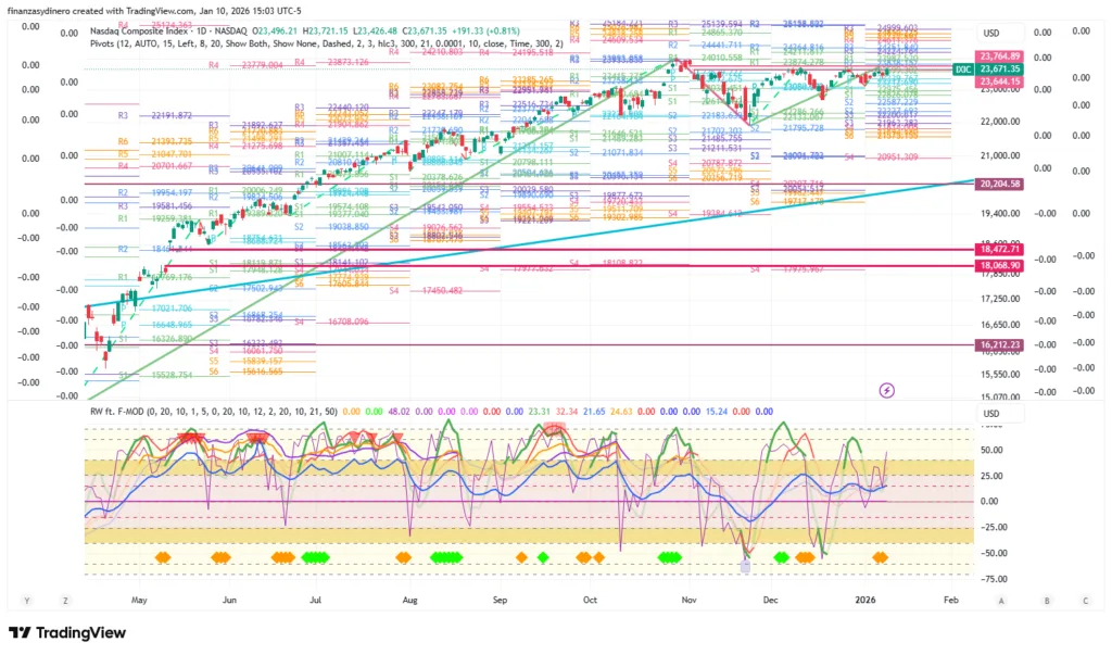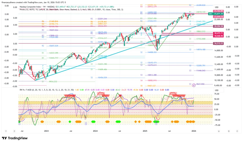 Cierra la semana con ganancias y nuevamente prueba la resistencia formada por el gap bajista del 3-4 de noviembre entre los 23,764.87 y 23,644.15. De ser superado siguiente objetivo alcista seria 24,210. Aumenta la atención sobre la burbuja-no-es-burbuja I.A.