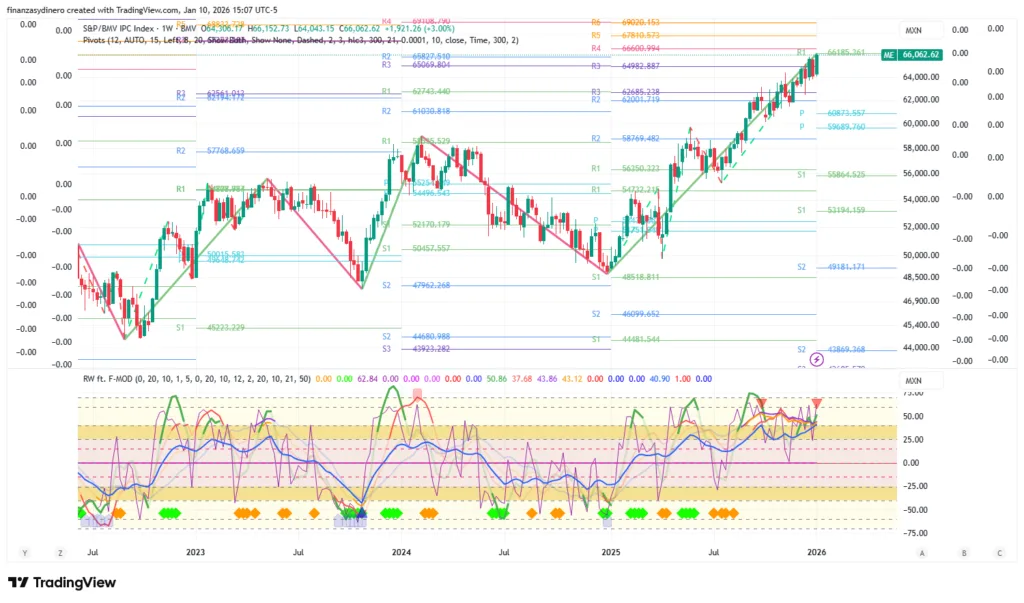 Cierra una semana de fuertes ganancias y se acerca al objetivo alcista de 66,600. Objetivo bajista 62,685.