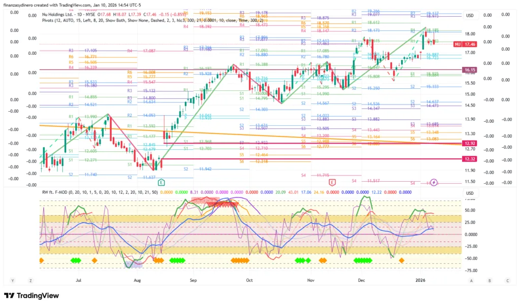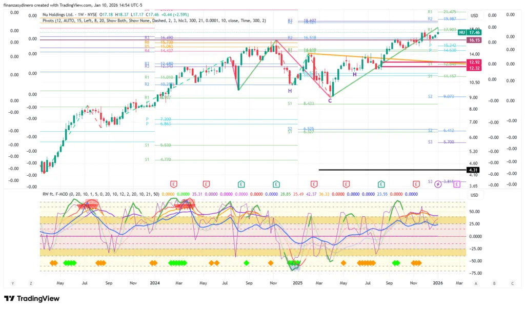 Cierra una semana de ganancias y alcanza el objetivo alcista del patrón HCH invertido: $18.36-18.83. Siguiente resistencia: $19.32 y soporte en zona $16.15-$16.51.