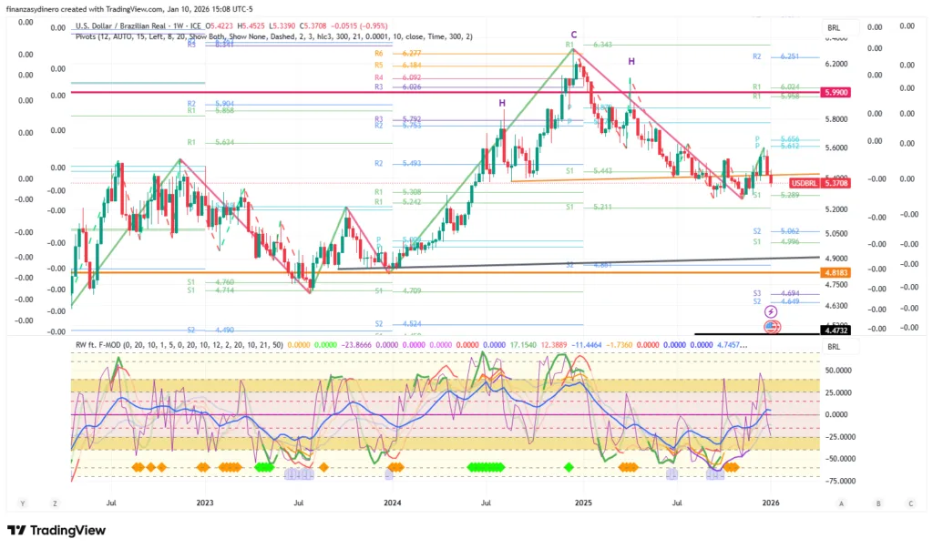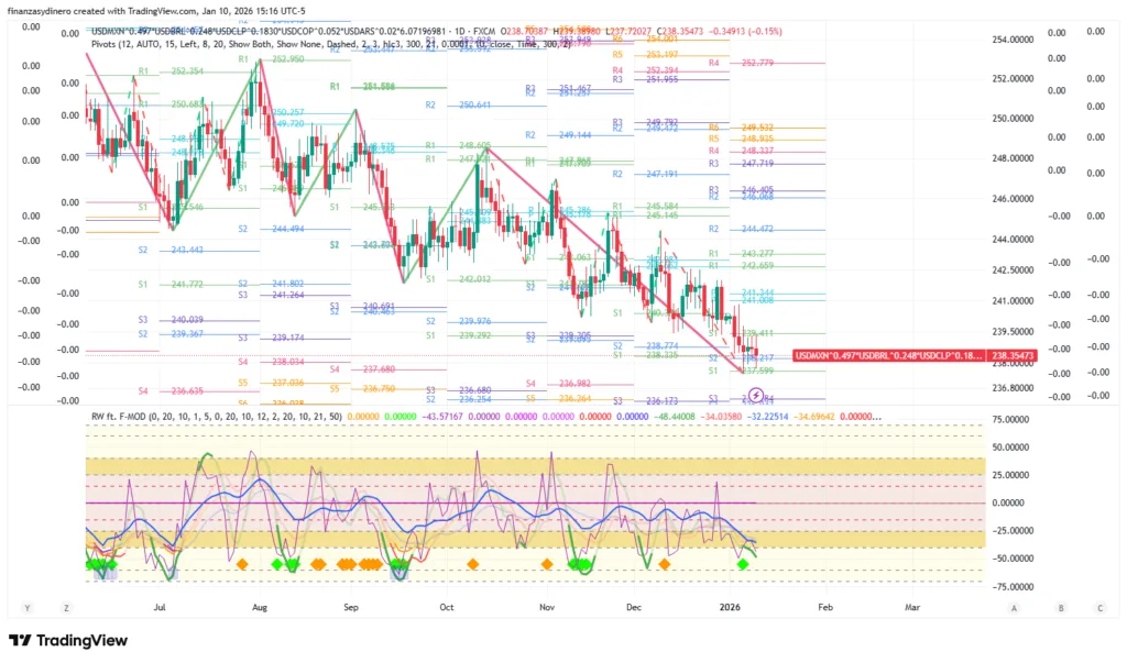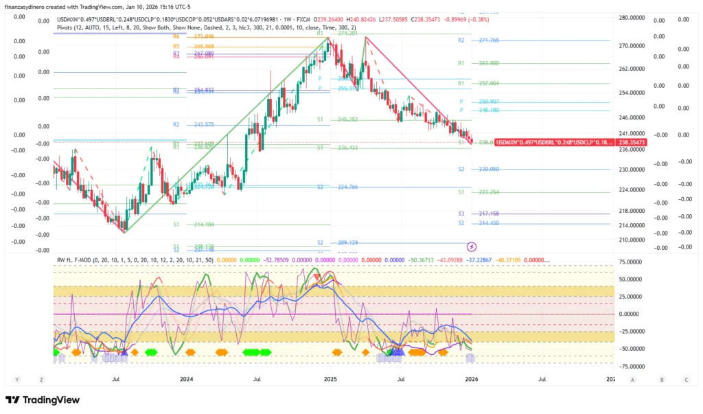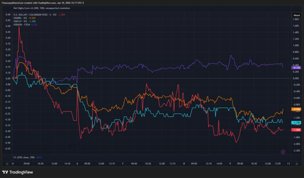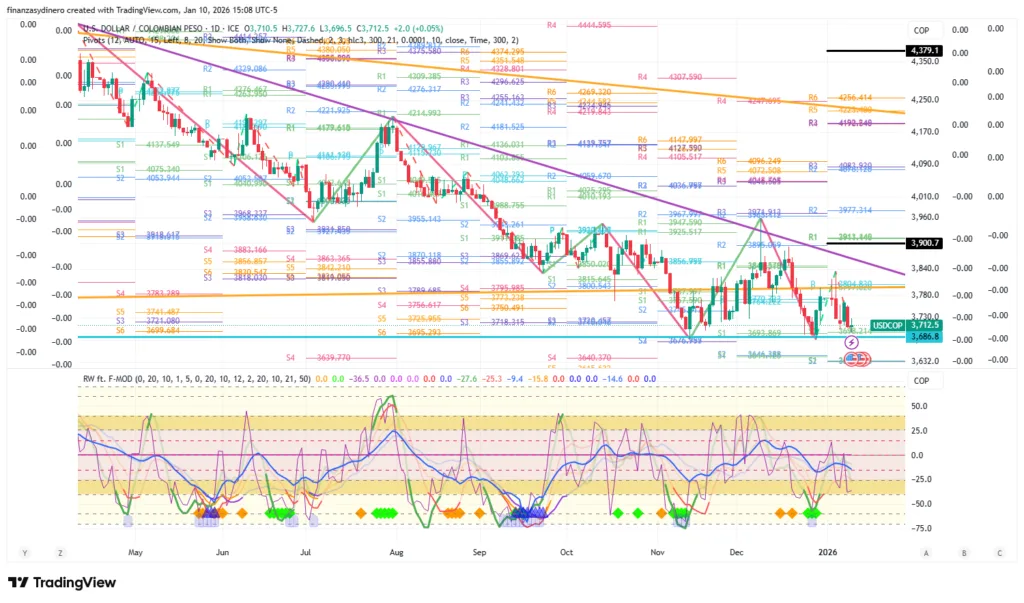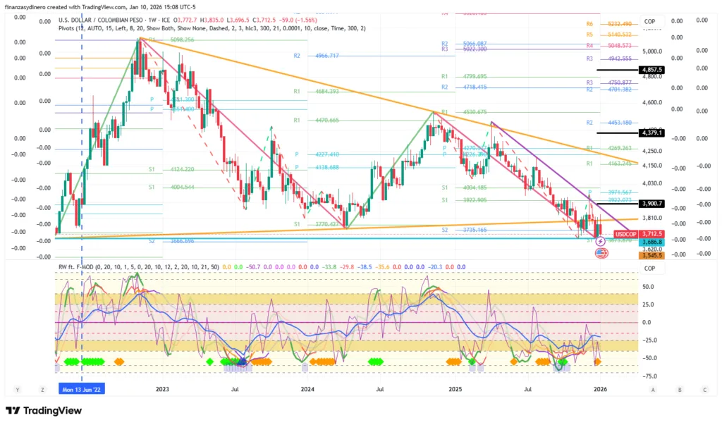 El mercado cambiario colombiano cerró la semana con pérdidas moderadas en el USD/COP, respetando zonas técnicas clave dentro de un patrón de cuña descendente de largo plazo. A pesar del retroceso, el peso colombiano fue la moneda latinoamericana con mejor desempeño frente al dólar, en un contexto regional que comienza a mostrar signos de agotamiento bajista y divergencias positivas.